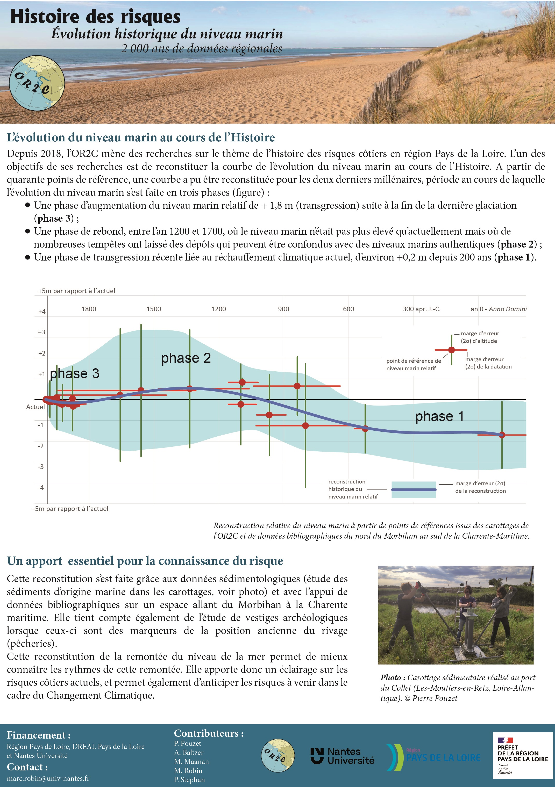 Depuis 2018, l’OR2C mène des recherches sur le thème de l’histoire des risques côtiers en région Pays de la Loire. L’un des objectifs de ses recherches est de reconstituer la courbe de l’évolution du niveau marin au cours de l’Histoire. A partir de quarante points de référence, une courbe a pu être reconstituée pour les deux derniers millénaires, période au cours de laquelle l’évolution du niveau marin s’est faite en trois phases (figure) :