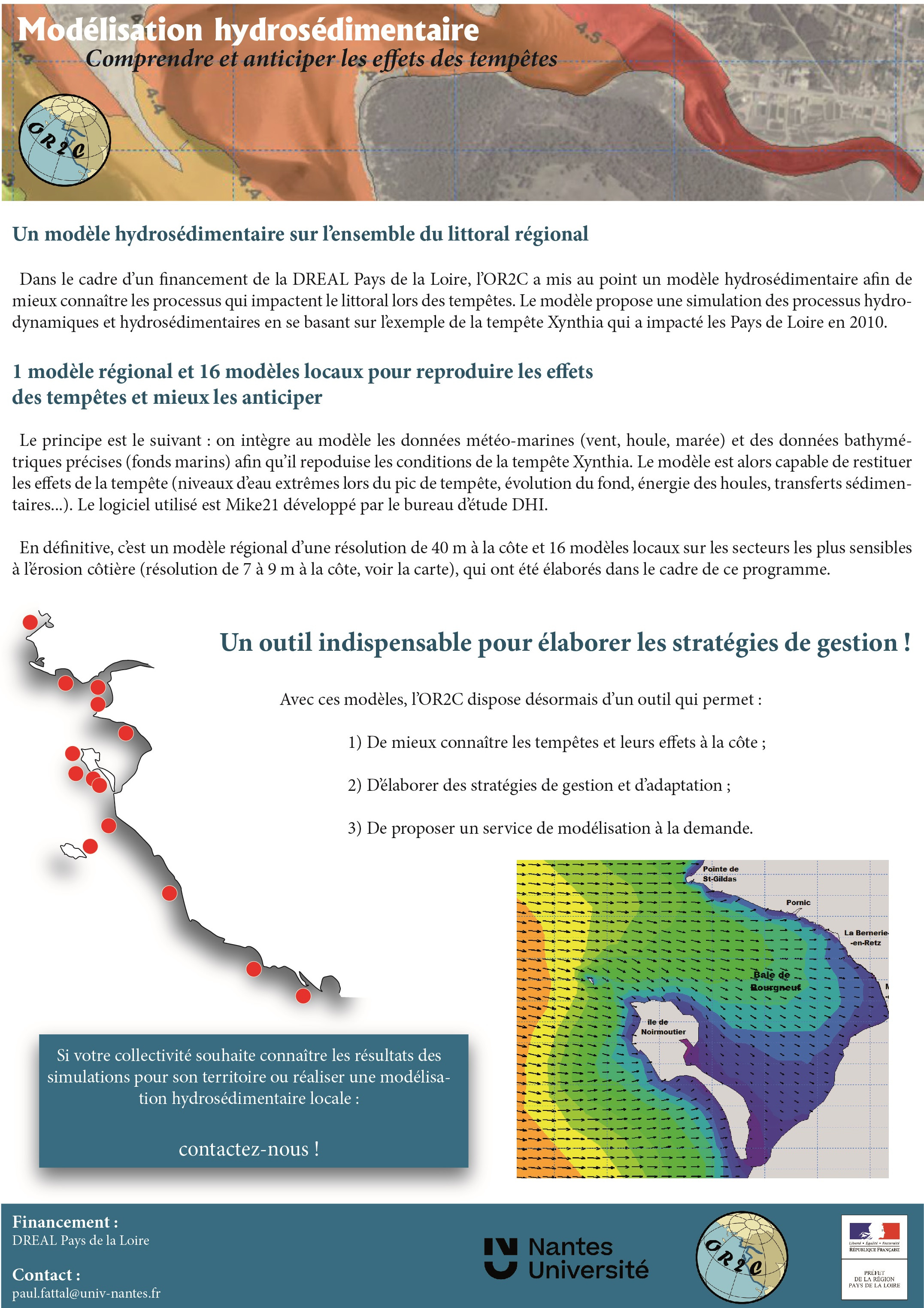 Dans le cadre d’un financement de la DREAL Pays de la Loire, l’OR2C a mis au point un modèle hydrosédimentaire afin de mieux connaître les processus qui impactent le littoral lors des tempêtes. Le modèle propose une simulation des processus hydrodynamiques et hydrosédimentaires en se basant sur l’exemple de la tempête Xynthia qui a impacté les Pays de Loire en 2010.